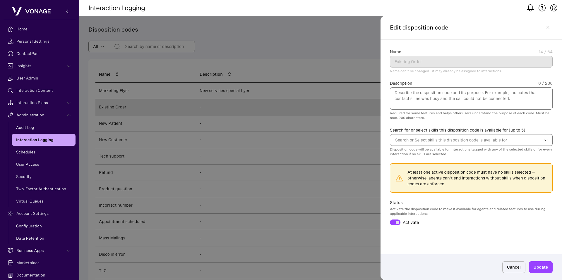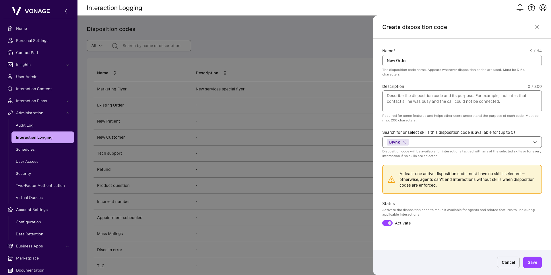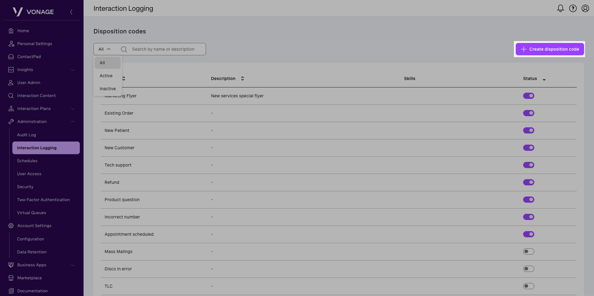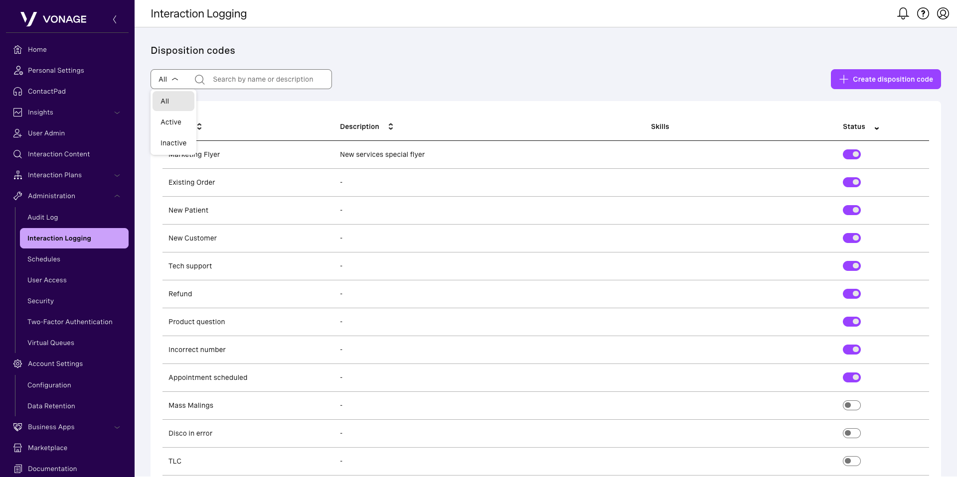If enabled for your account, Interaction Logging in Vonage Contact Center (VCC) allows supervisors to manage disposition codes used by agents to log the outcome of interactions. From this area, you can view default disposition codes, create new ones, update descriptions, assign specific codes to skills, and control whether codes are active or inactive. Agents can select active disposition codes during interactions.
