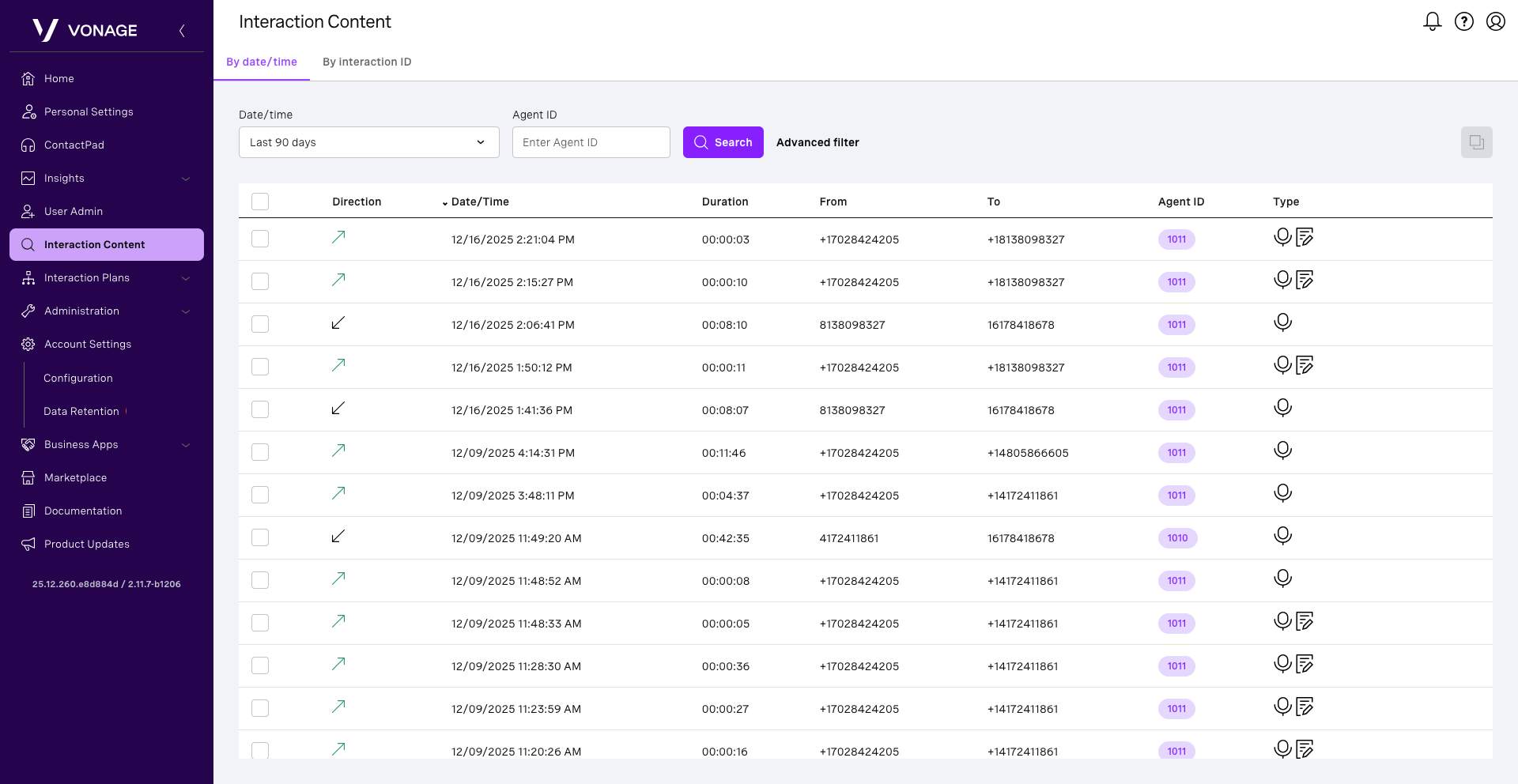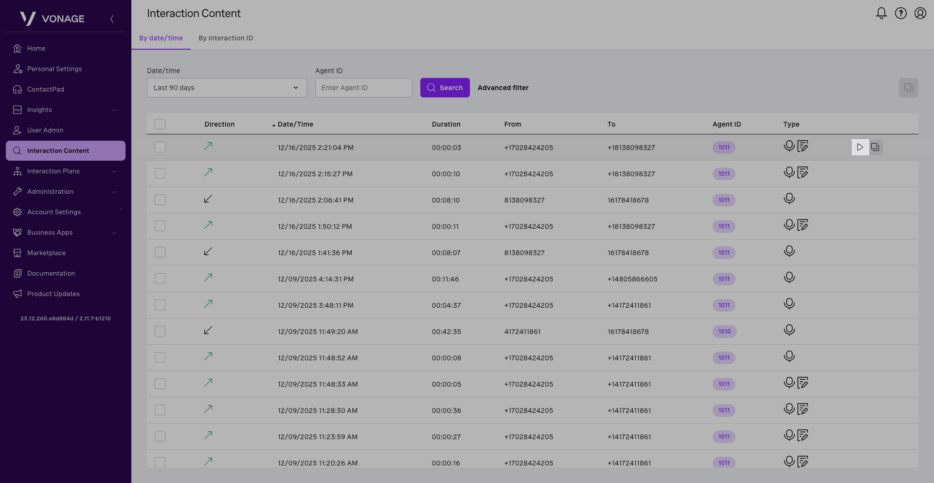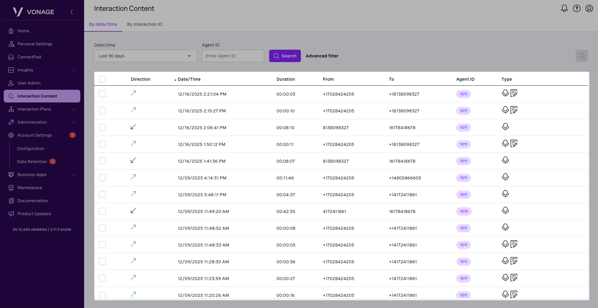 In the Interaction Content area of the VCC Admin Portal, you can search and view content from inbound and outbound interactions.