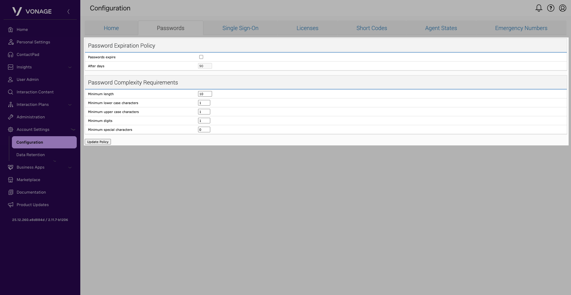 A login policy can be configured on the VCC Admin Portal. This policy determines the minimum strength of a password for a user. A strong password can enhance the security of your VCC Admin Portal and ContactPad systems.