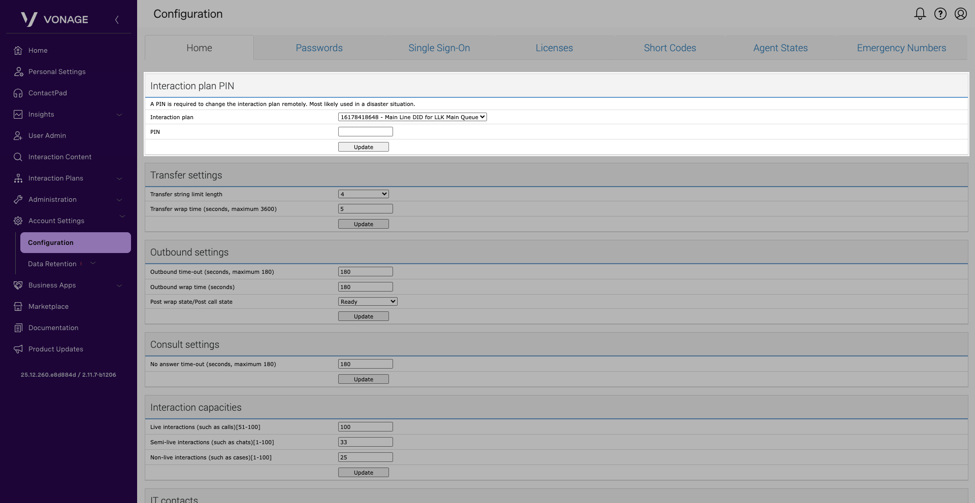 Interaction plan PIN – A PIN is required to change the interaction plan remotely. Most likely used in a disaster situation. To change your PIN, from the home tab, find the Interaction plan PIN table. Select the phone number or queue you would like to change the PIN for. The list contains the numbers available in your account. Next, input a new PIN number. When finished, click Update. A pin and an active Dial In Config applet are needed if you would like to change your system’s routing remotely by calling a VCC “Useful telephone number.”