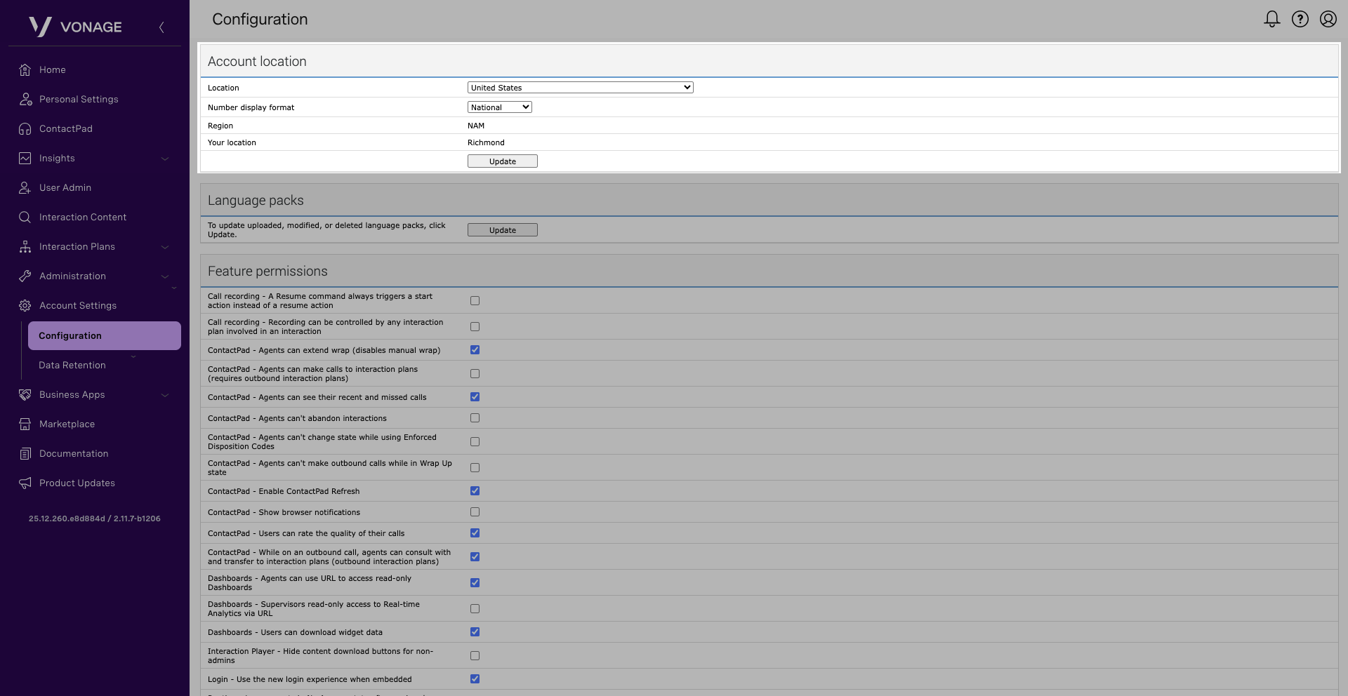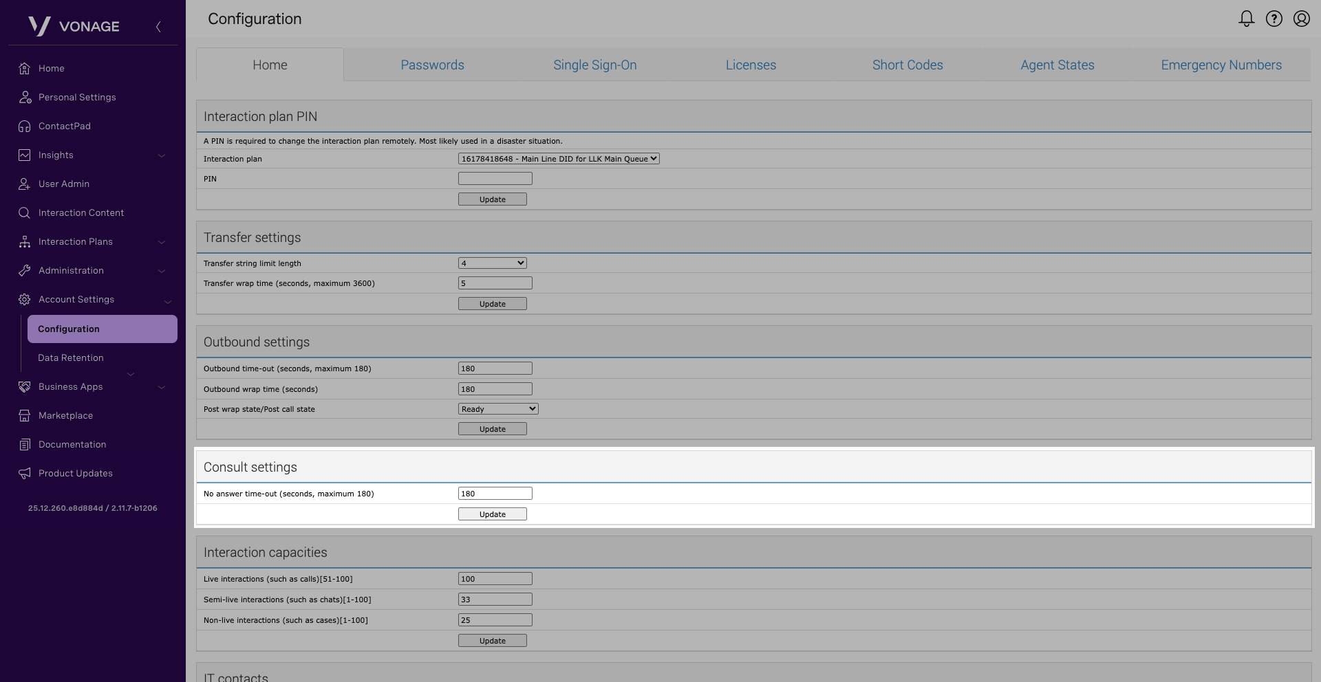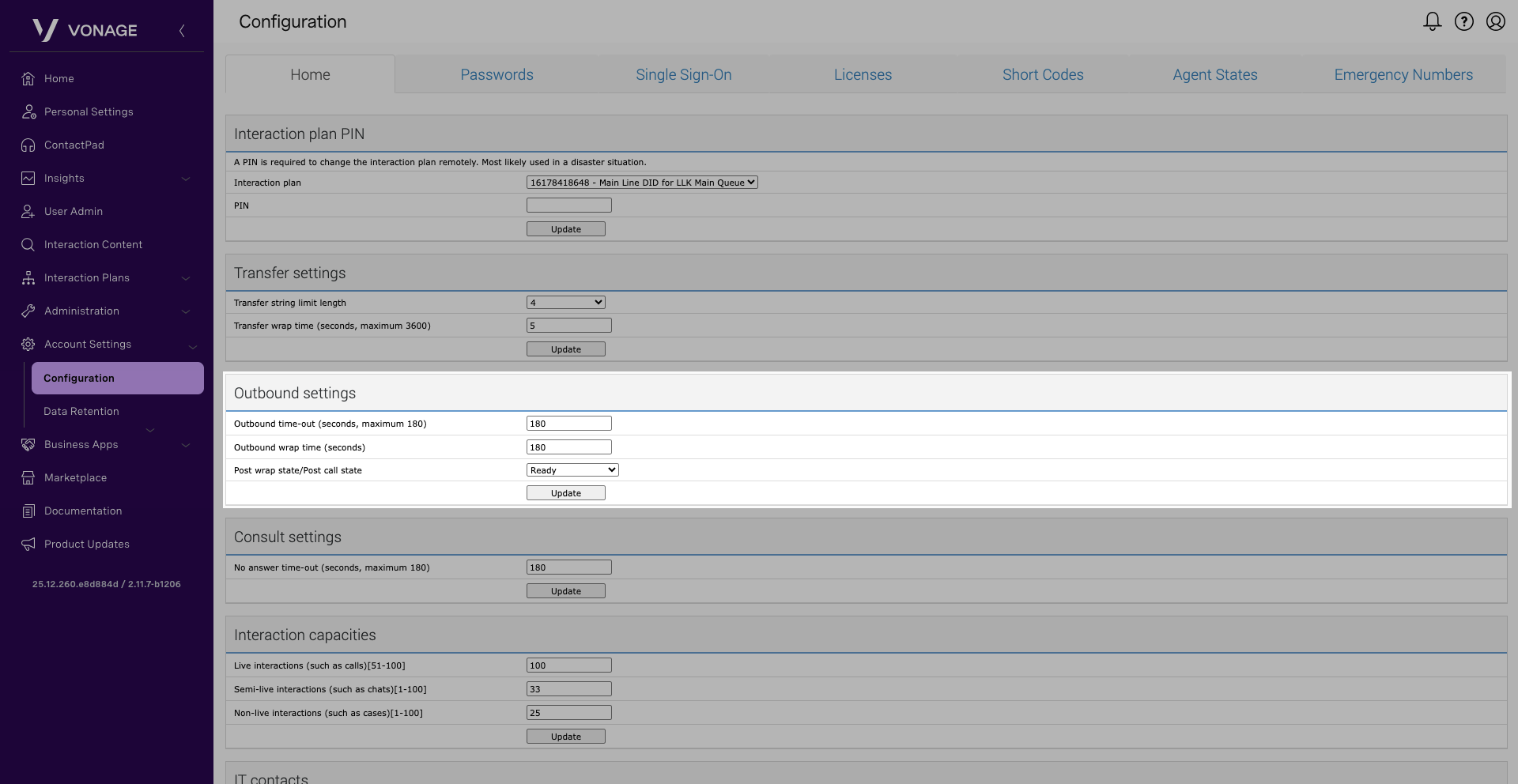 To access your account settings configurations, from the VCC Admin Portal homepage, click the Account Settings tab in the left navigation and then Configuration. In the Home tab, you can configure the following settings:
