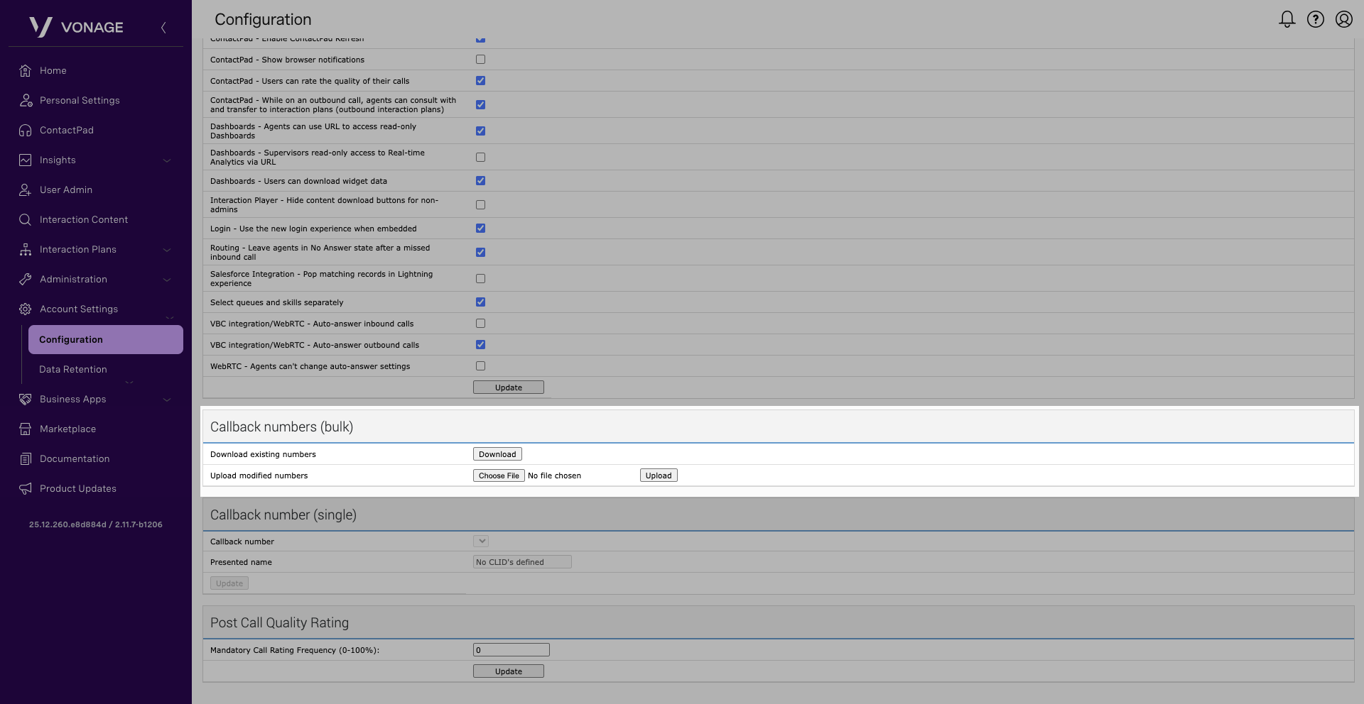 Callback numbers – When an agent makes an outbound call, Vonage Contact Center presents a number to the person they are calling. This number is a callback number. To modify the callback numbers in bulk: these steps: