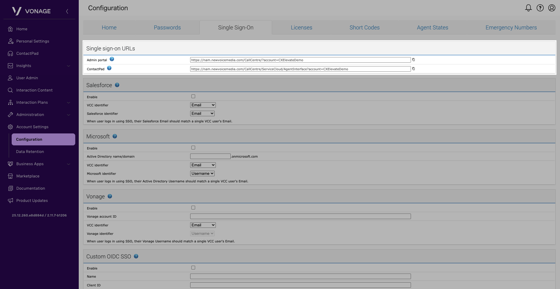 To configure these settings, open Account Settings, select Configuration, and then click the Single Sign-On tab. In the Single Sign-On URLs section, the URLs that VCC Admin Portal supervisors and agents must use to access the single sign-on pages are displayed for the Admin portal and ContactPad. Click the icon alongside the field to copy the contents of the field to the Clipboard.