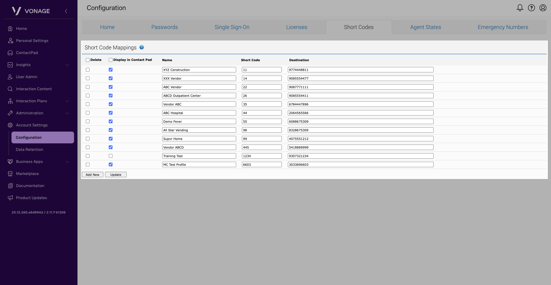 To configure these settings, open Account Settings, select Configuration, and then click the Short Codes tab. In the Short Code Mappings area, you may see some short codes already generated. To add a new shortcode, click Add New. Proceed to provide the following information: