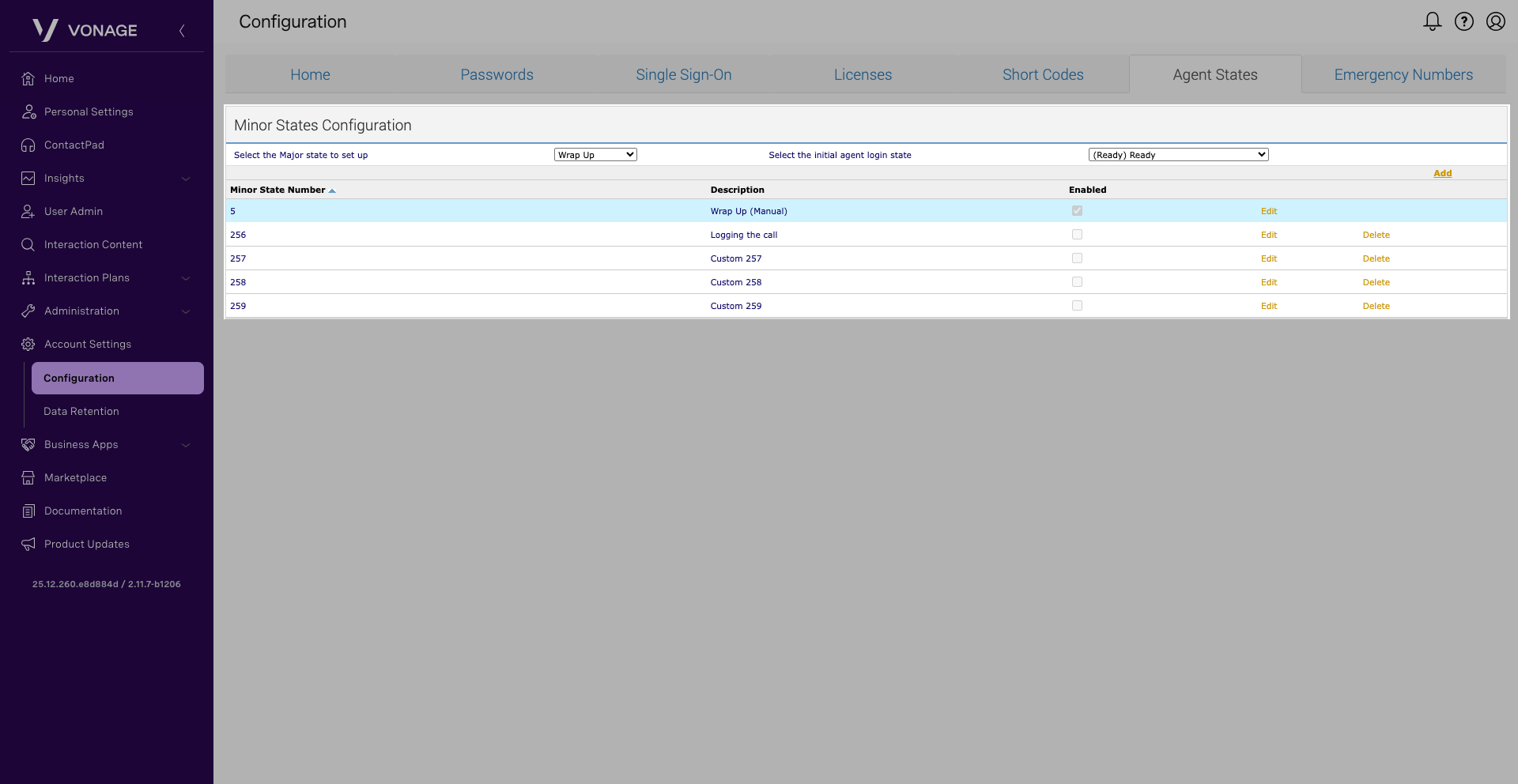 Agent states track an agent’s activity and make an agent available to take calls. To configure these settings, open Account Settings, select Configuration, and then click the Agent States tab.