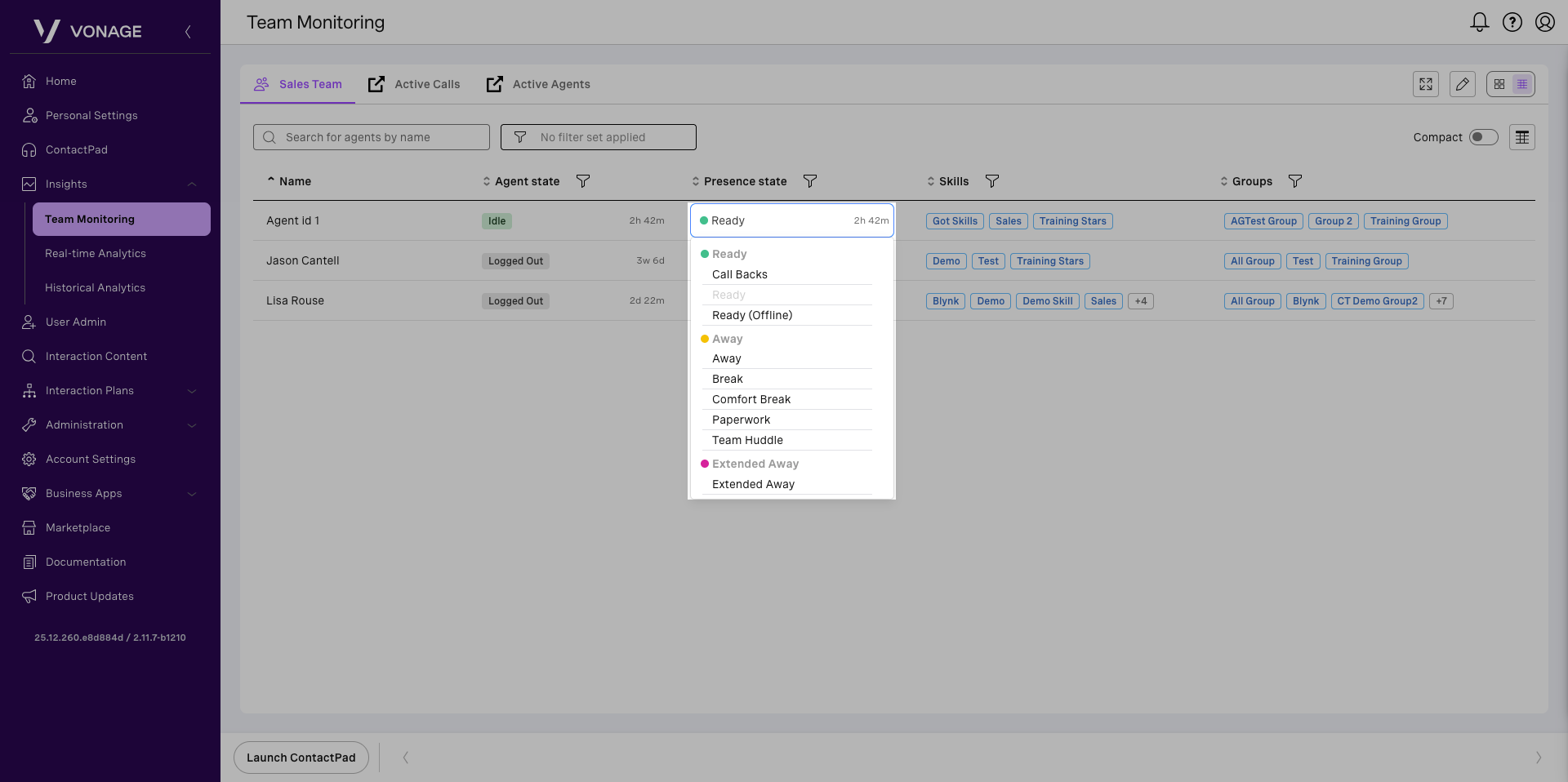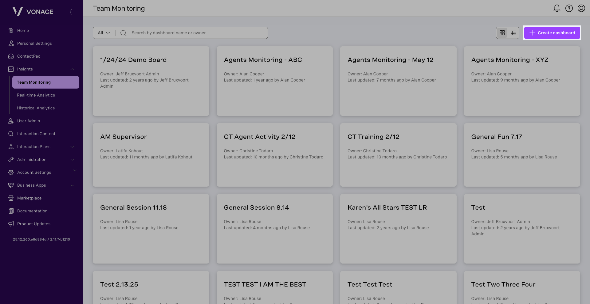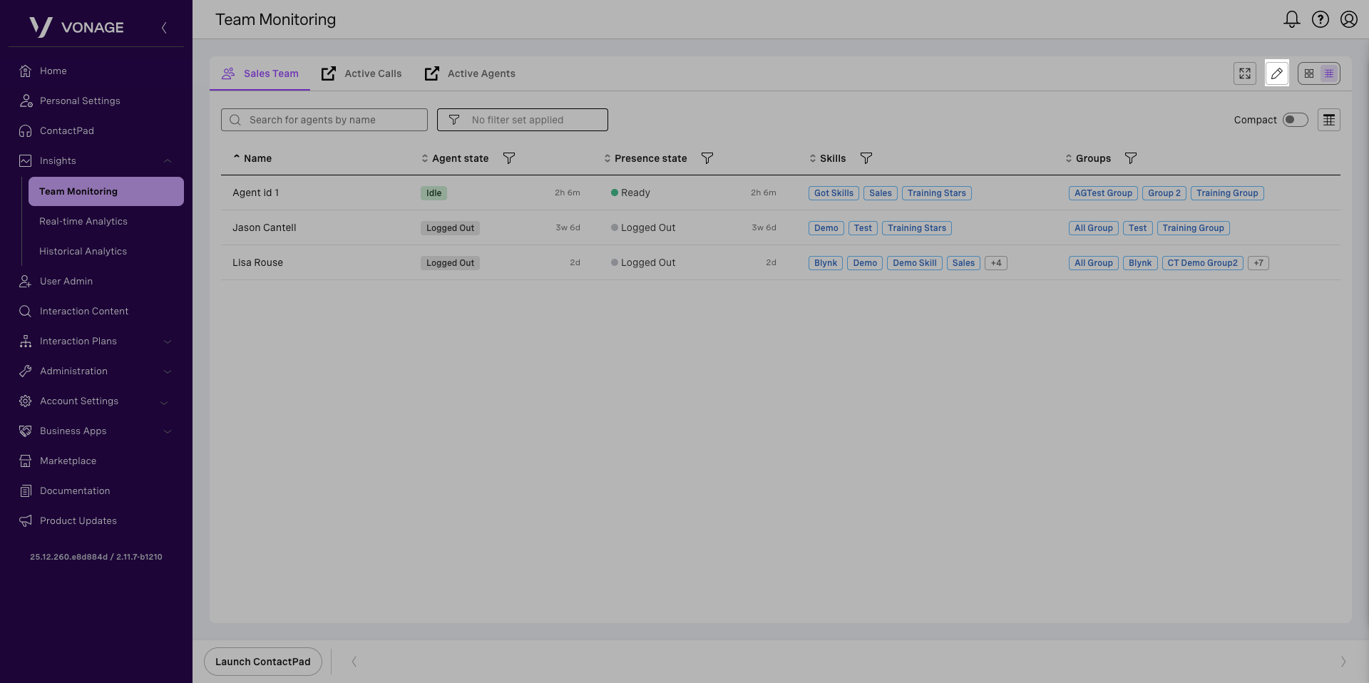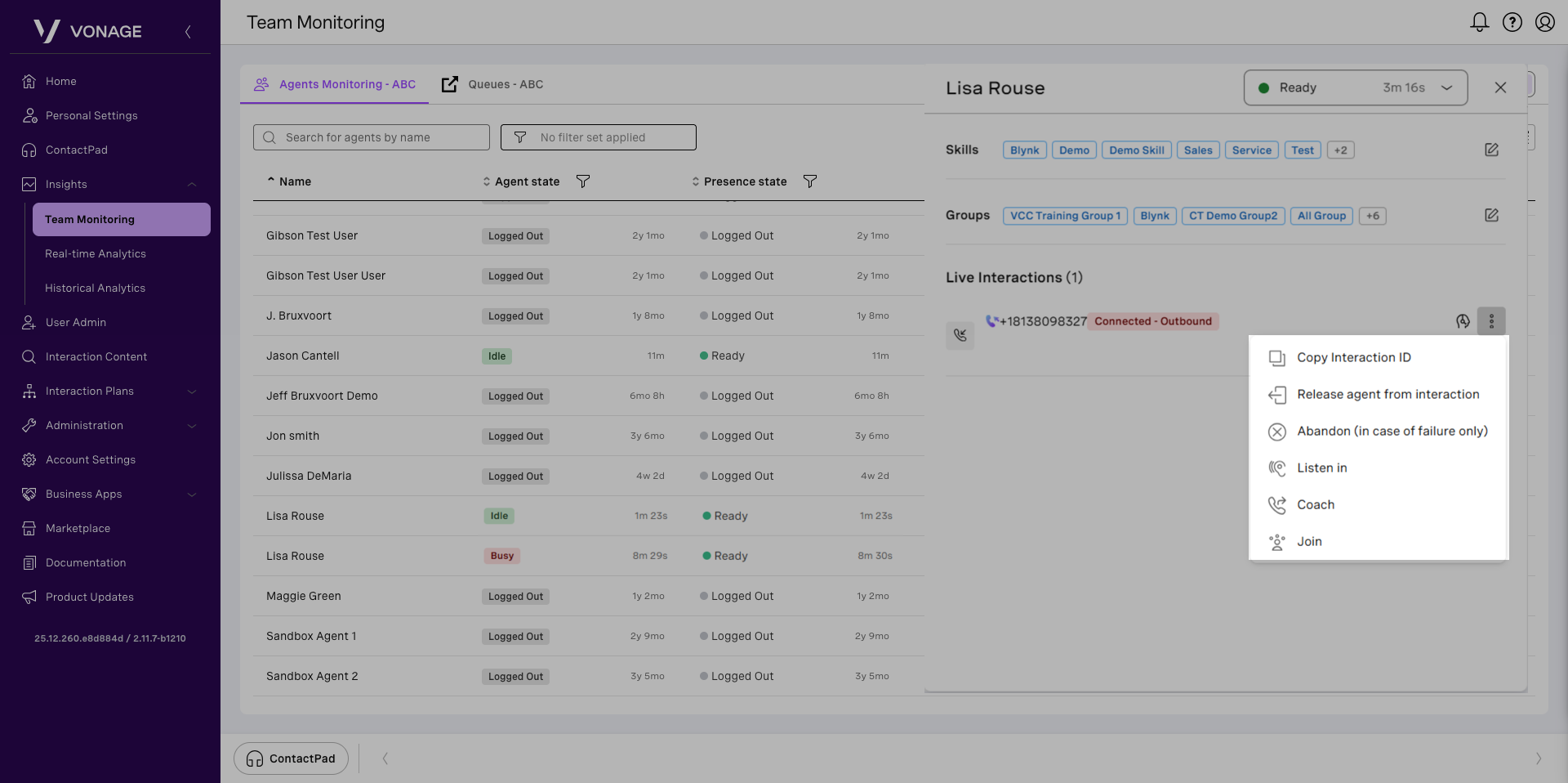 Team Monitoring serves as the main interface for call center supervisors. From the left-hand menu, select Insights and then Team Monitoring to open the feature. Supervisors can create dashboards that contain teams of agents, which they add individually or by user groups or skills. Supervisors can perform the following tasks:
