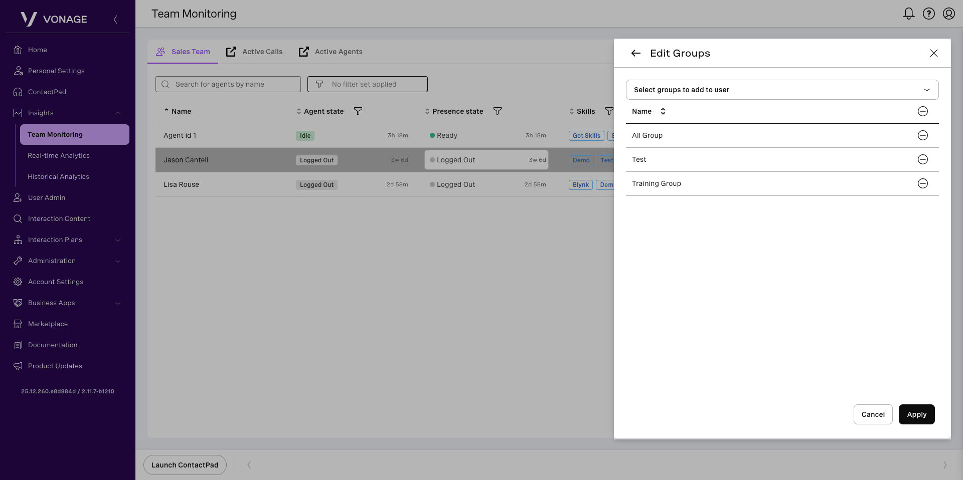 To change an agent’s group they are assigned to, locate the agent within the desired Team Monitoring dashboard. Click the agent’s row to expand their details in a side panel. Click the Edit User Groups icon. Edit groups appears and you can add or remove groups.