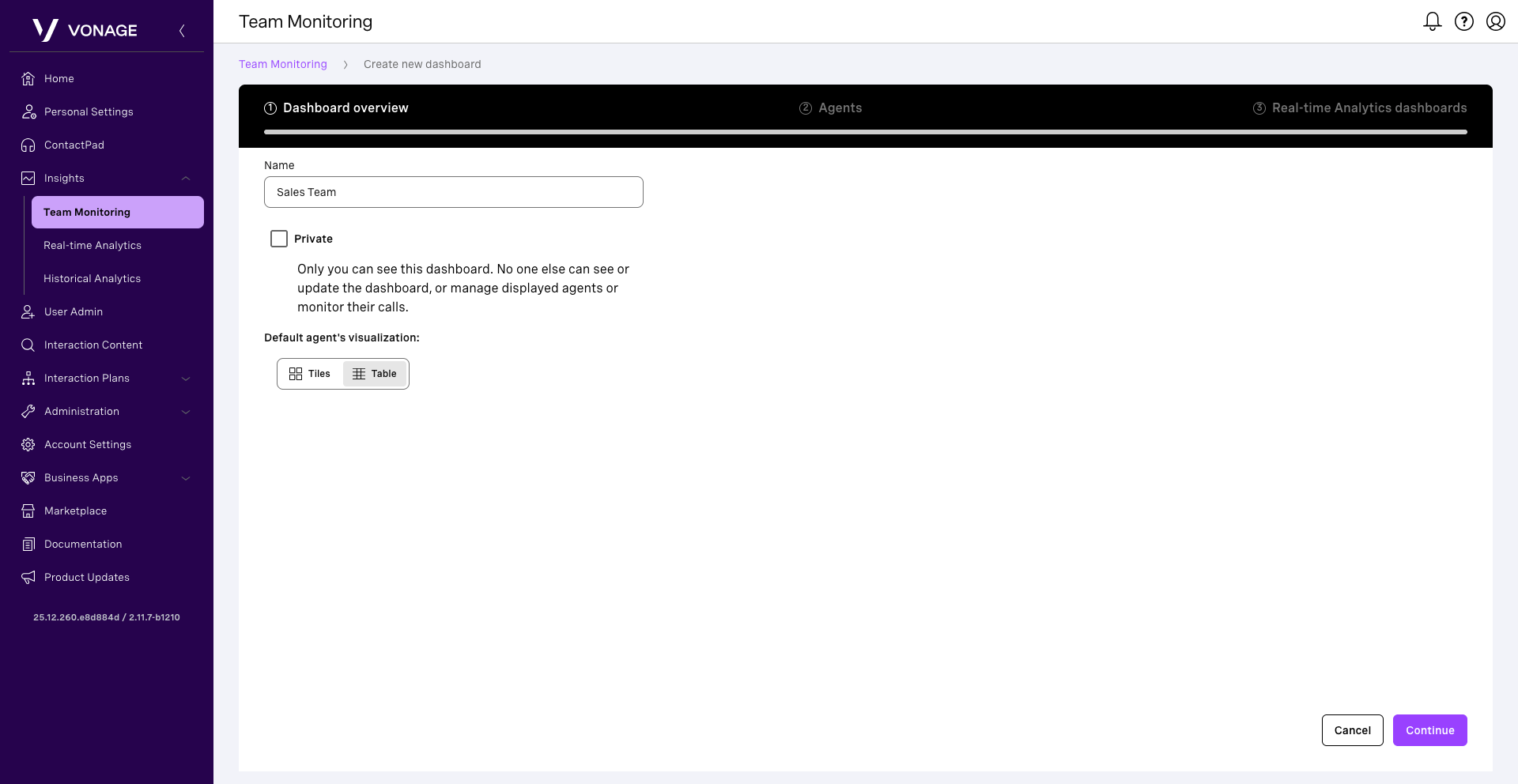 In the Dashboard overview Enter a Name for the dashboard. Choose whether the dashboard is Private or visible to users with Team Monitoring access. Click Continue.