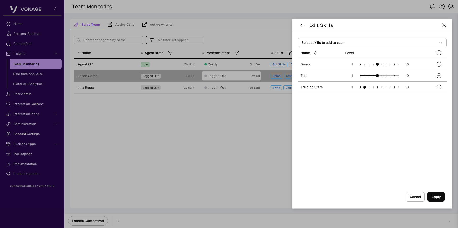 To change an agent’s assigned skills, locate the agent within the desired Team Monitoring dashboard. Click the agent’s row to expand their details in a side panel. Click the Edit User Skills icon. Edit skills appears and you can add skills, adjust skill levels for the user, or remove skills.